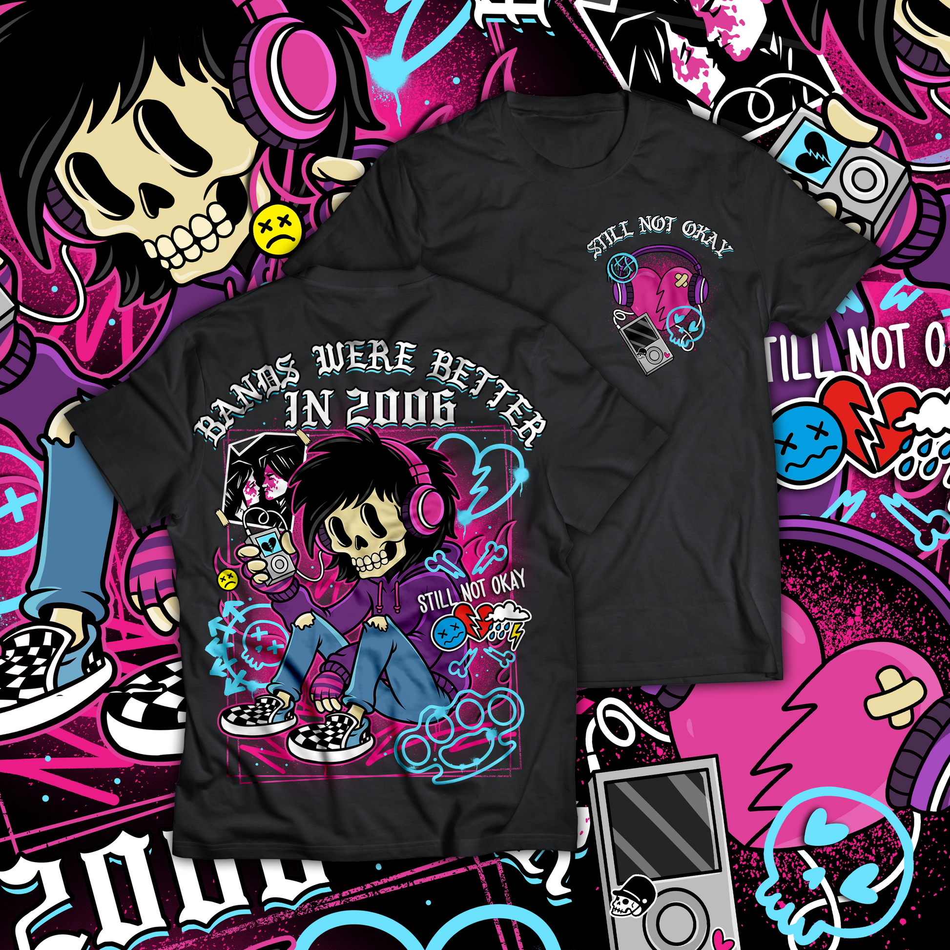 Throw it back to the golden age of skinny jeans, checkered shoes, and blasting MySpace playlists on repeat. This tee captures the true emo revival energy with a bold graphic featuring a skeleton scene kid rocking headphones, ripped jeans, and an iPod – because let’s face it, bands really were better in 2006.