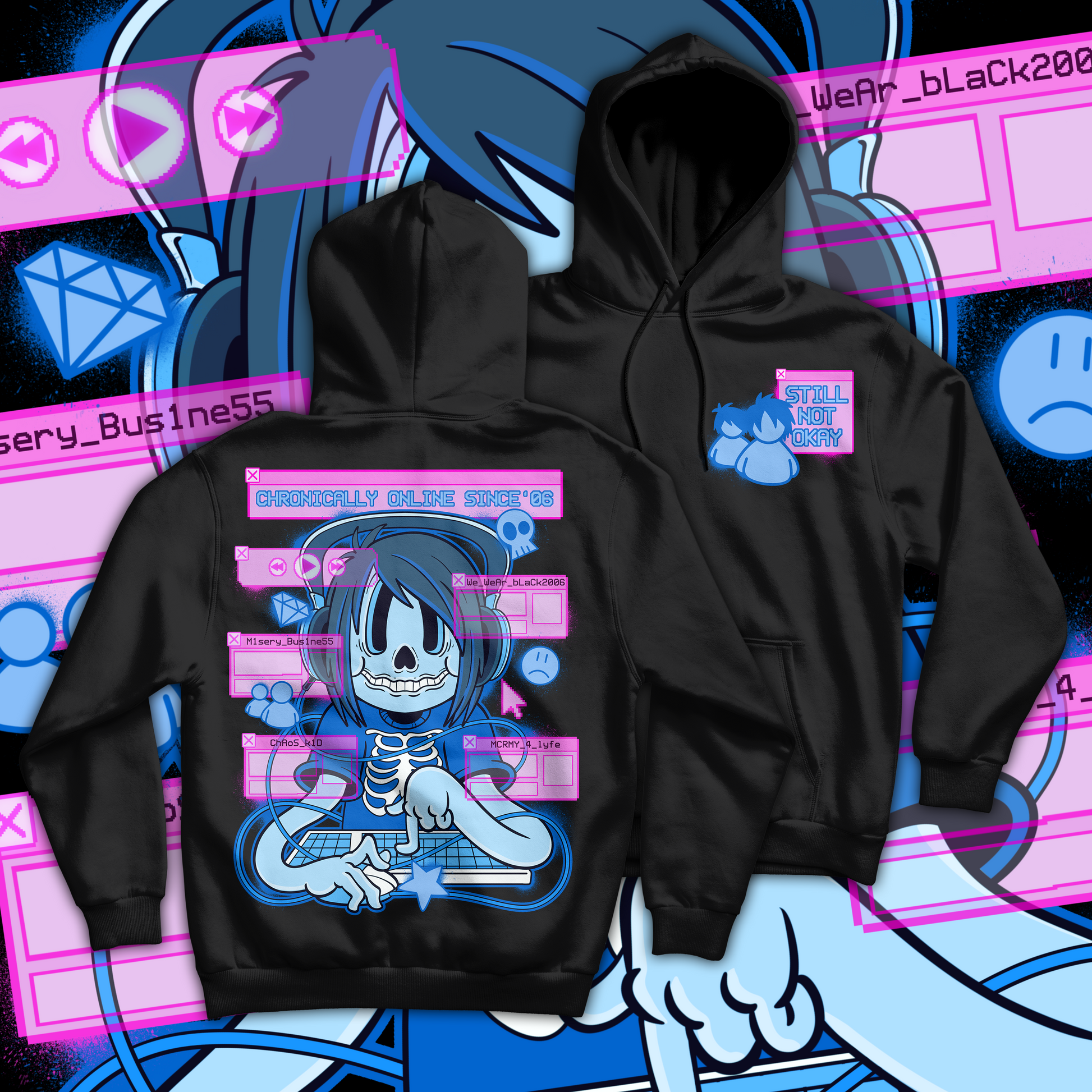 This shirt features a blue-hued skeleton emo kid tapping away on a CRT-style PC, surrounded by glitchy pop-ups with throwback usernames like "Misery_Bus1ness" and "MCRMY_4_lyfe." Neon pink windows and early internet icons bring it all together in a chaotic, painfully nostalgic composition. The front pocket-style print reads “Still Not Okay,” because, let’s face it—neither are we.
