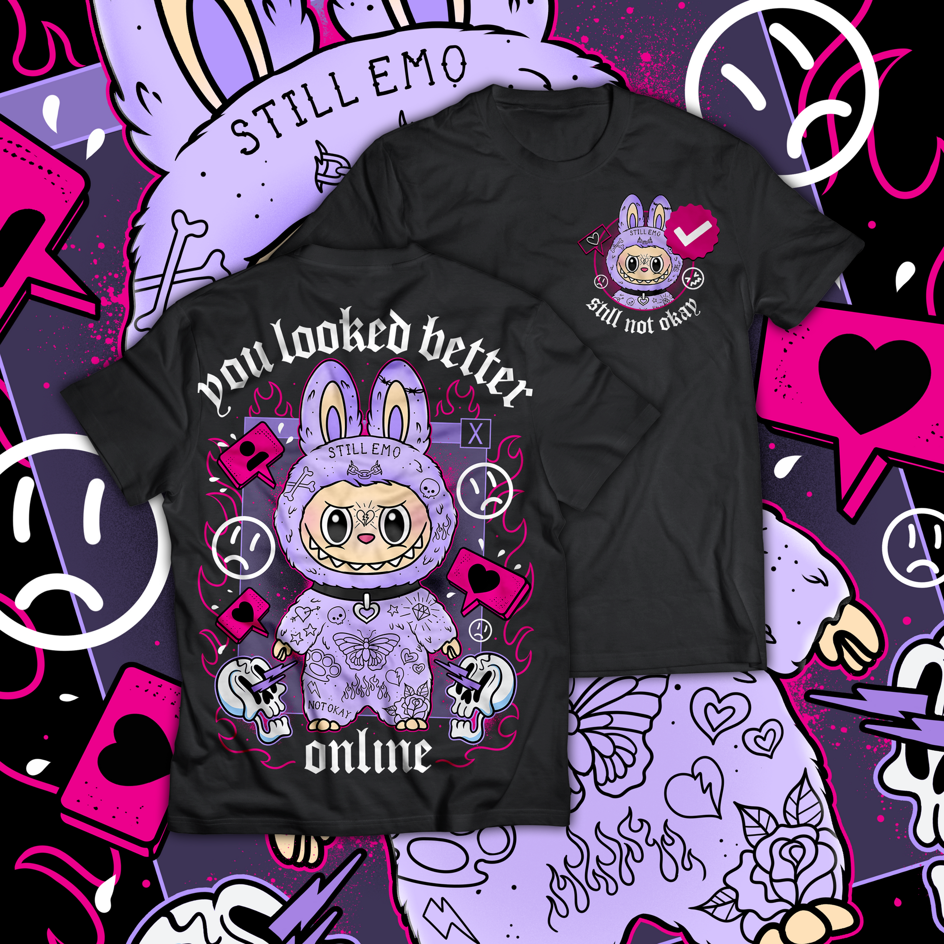 🐰 Front chest hit with mini character + “still not okay” checkmark badge