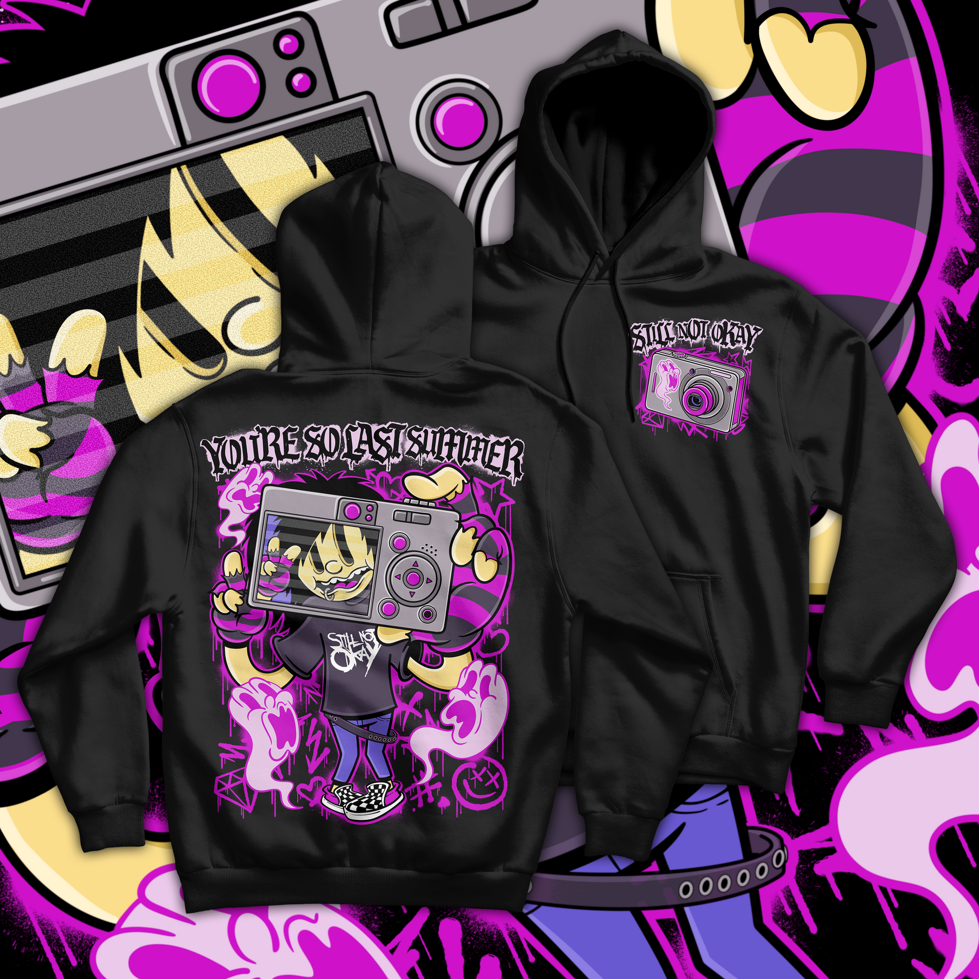Throw it back to the golden days of MySpace, eyeliner, and digital cameras with the “Last Summer” Hoodie. This loud, nostalgic design features a mischievous cartoon character snapping a pic with a chunky retro camera, surrounded by grungy purple smoke and pop-punk chaos.