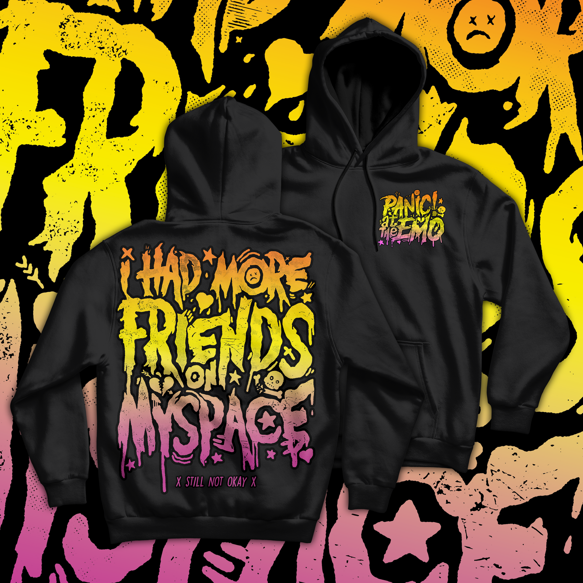 The front features a small Panic at the Emo logo in chaotic, colorful drips, while the back makes a bold statement — "I Had More Friends on MySpace" — splashed across a yellow-to-pink gradient with grimy, nostalgic emo lettering.
